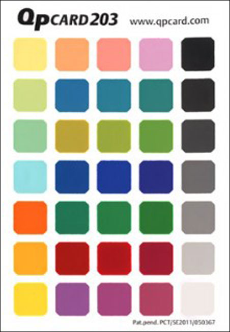 The design and preparation of the color card is crucial for successful color management of the camera.QPcard 202 &203 have 35 coated color chips mounted on a cardboard surface. The carefully selected color samples are individually mixed in order to achieve as straight-forward spectral response as possible. This is very important in order to avoid undesired metameric effects that can ruin correct evaluation of the color performance.